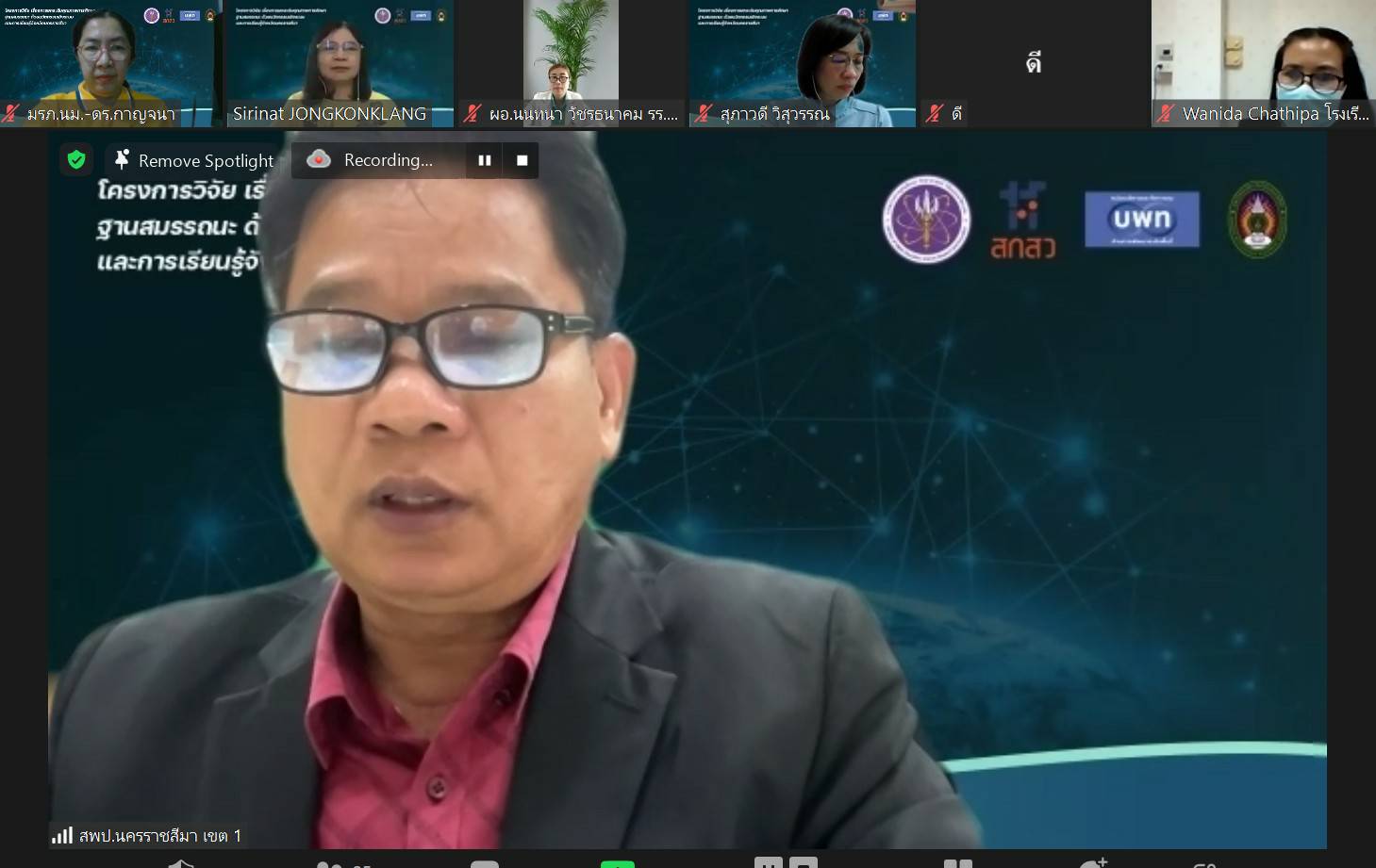 นำเสนอโครงการวิจัยต่อ อ.ก.ศ.จ. นม. ท่านชาญวิทย์ ทับสุพรรณ ประธานอนุกรรมการการศึกษา จ.นครราชสีมา ท่านกิตติ บุญเชิด อนุกรรมการการศึกษา จ.นครราชสีมา ท่านกฤตพล ชุติกุลกีรติ ศึกษาธิการจังหวัดนครราชสีมา ผู้ทรงคุณวุฒิ ภาคีเครือข่ายการศึกษาทุกภาคส่วน การสนทนากลุ่ม เพื่อรับฟังข้อคิดเห็น มุมมองเพื่อขับเคลื่อนการจัดการศึกษาฐานสมรรถนะ จ.นครราชสีมา การพัฒนานวัตกรรมเชิงระบบ 5 ด้านบนความหลากหลายของหน่วยงานหลักในเชิงนโยบาย Meso และหน่วยปฏิบัติ Micro -เมื่อวันที่ 27 เมษายน 2565-